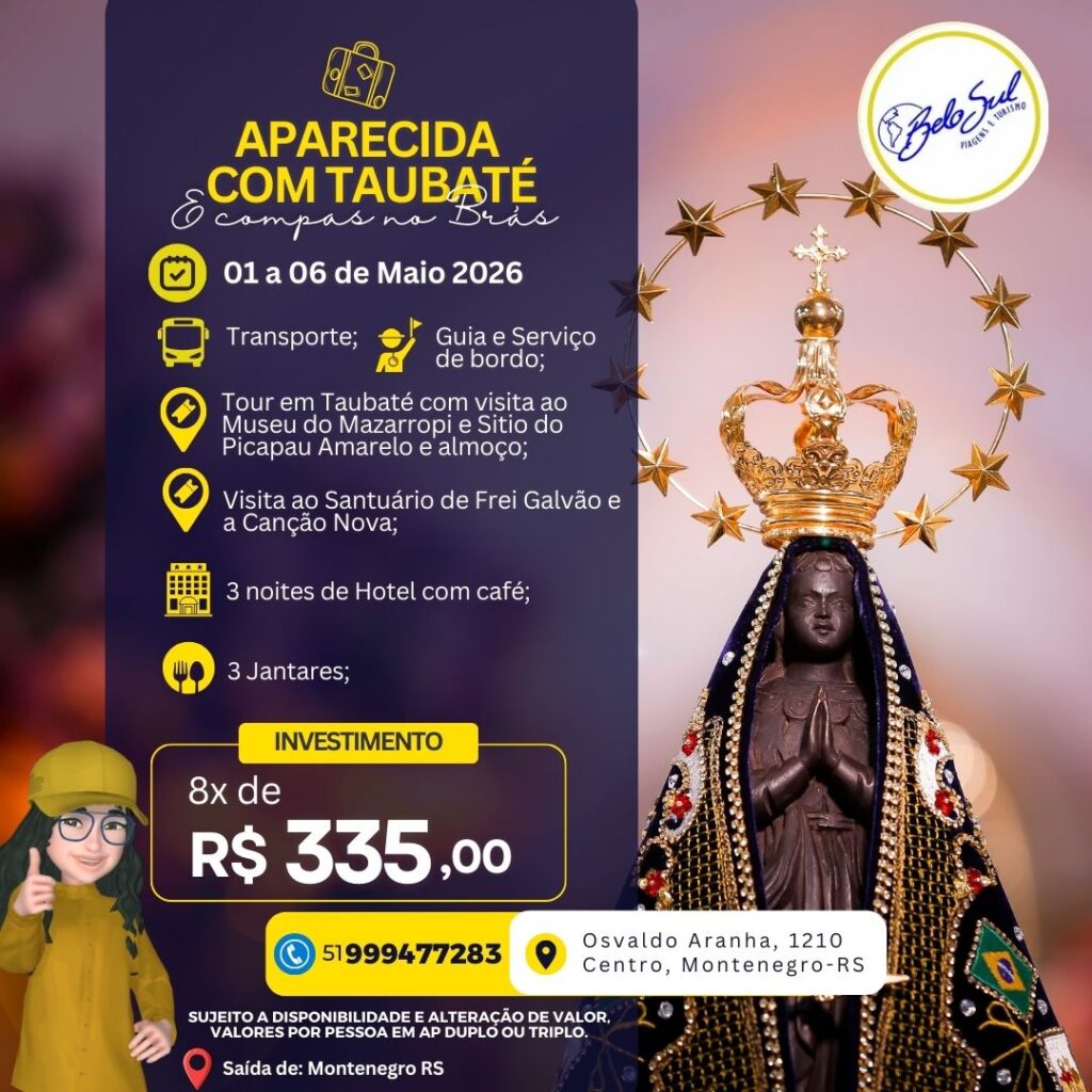 Chegada pela manhã com tour em Taubate/SP com visita ao Museu do Mazzarope e Museu do Sitio do Picapau Amarelo, almoço. A tarde seguimos para Aparecida, hospedagem e tarde livre. Jantar incluso no Hotel.